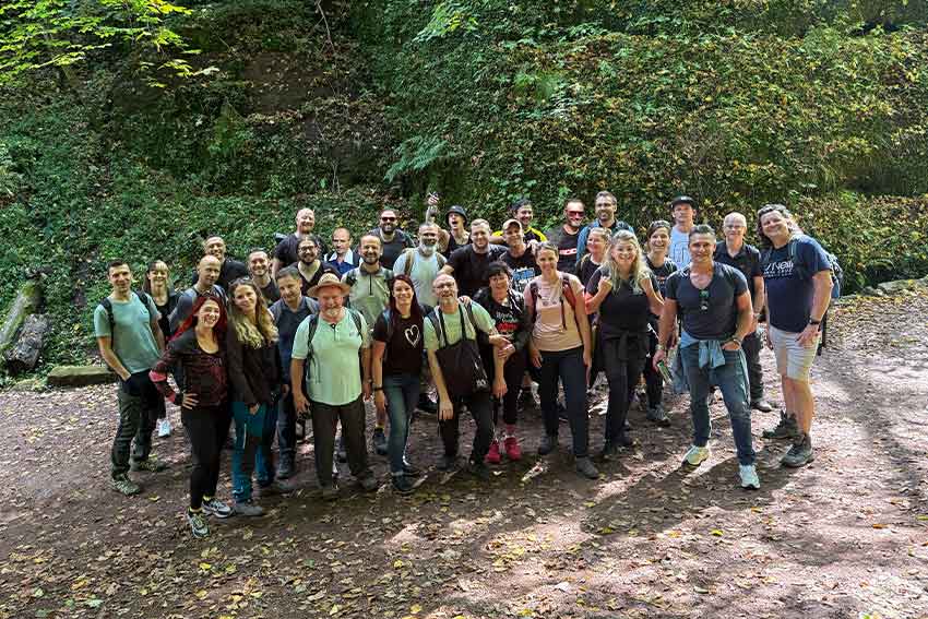 33 enthusiastic colleagues, perfect weather, and one plan: get out of the office and into adventure! This year’s trail led us through the Landgrafenschlucht and up to the Hohe Sonne, a climb of 320 meters in elevation that we were determined to conquer. And yes: everyone made it! (Even those who, over morning coffee, still wondered whether they belonged more to Team Coffee & Cake or Team Mountain Goat). At the top, we were rewarded with a breathtaking view of the Wartburg. The stunning panorama made us forget the effort in no time and, of course, it turned out to be the perfect photo spot.